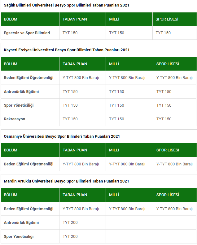 BESYO puanları genel olarak bu şekildedir. Ayrıca Karabük üniversitesi BESYO Spor bilimleri taban puanları beden eğitimi öğretmenliği Y-TYT 800 bin barajı taban puan. Antrenörlük eğitimi TYT 150. Milli, 800 bin barajı, Antrenörlük eğitimi milli TYT 150. Spor lisesi TYT 800 bin barajı, Antrenörlük eğitimi TYT 150 şeklindedir.